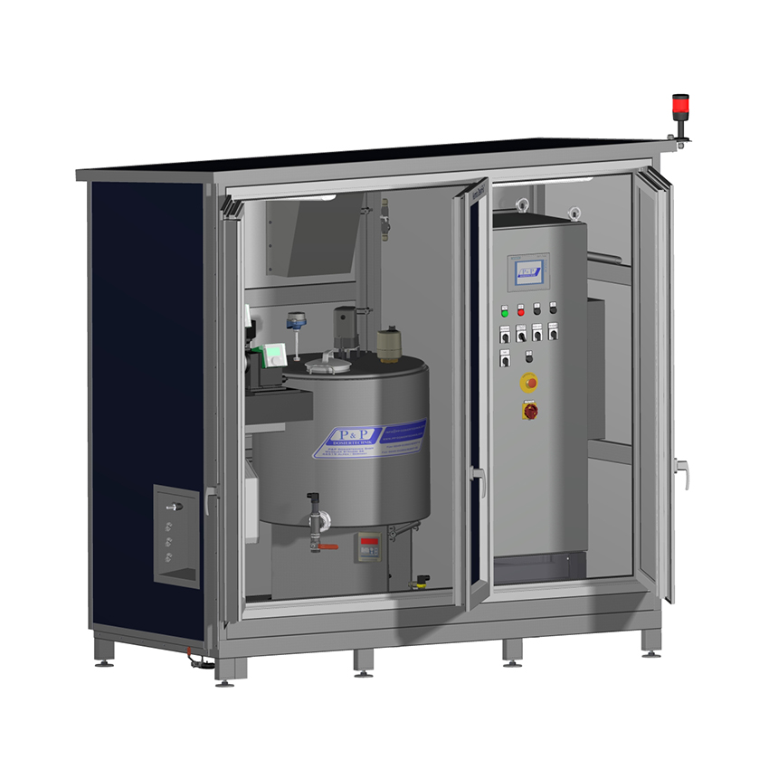 Biocide make-up unit for continuous production of a highly-efficient biocide solution inside a closed mixing system with online dosage.