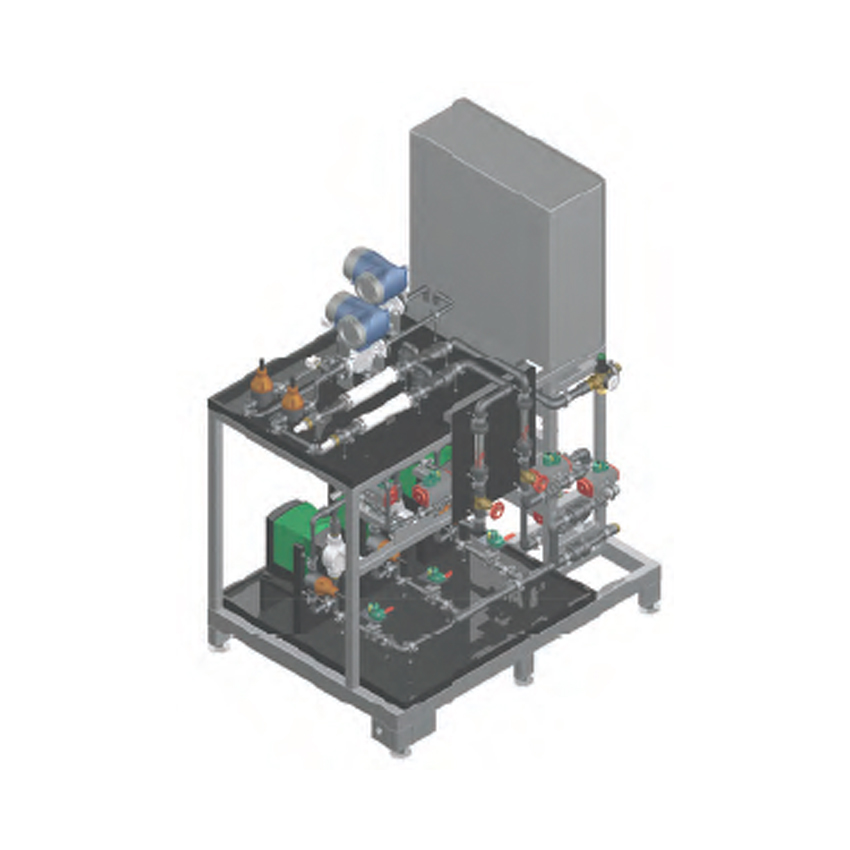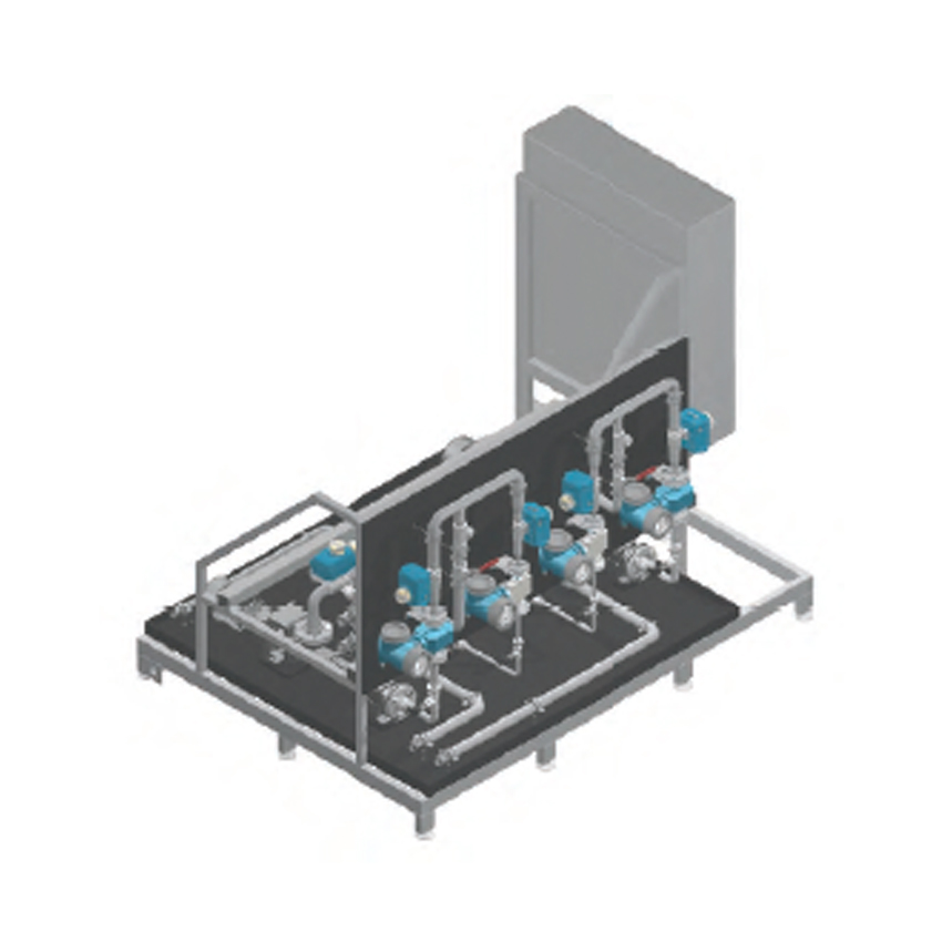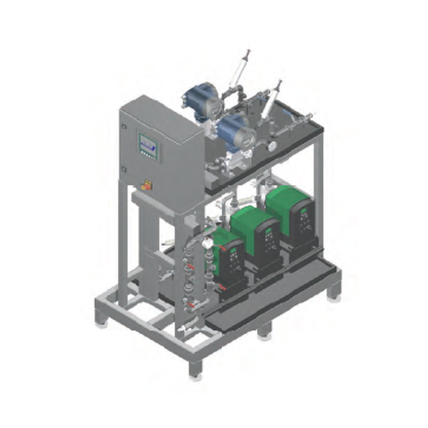 Kontinuierliche Herstellung einer exakt konzentrierten Lösung. Die Anlage ist ausgestattet mit Membranpumpen, MIDs, Statikmischern, Druckhalteventilen und allen weiteren wichtigen Komponenten. Steuerung und Bedienung über SPS-Steuerung und Touchdisplay.